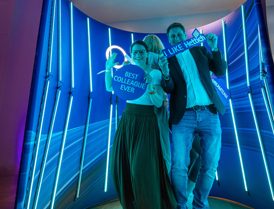 Die Kombination aus Drehen und Schwenken ermöglicht die kollisionsfreie Bewegung ganzer Korpusse und Einrichtungselemente. Das inspirierte uns zu der Wortschöpfung „Spinnovation“ und zum international verwendeten Claim.